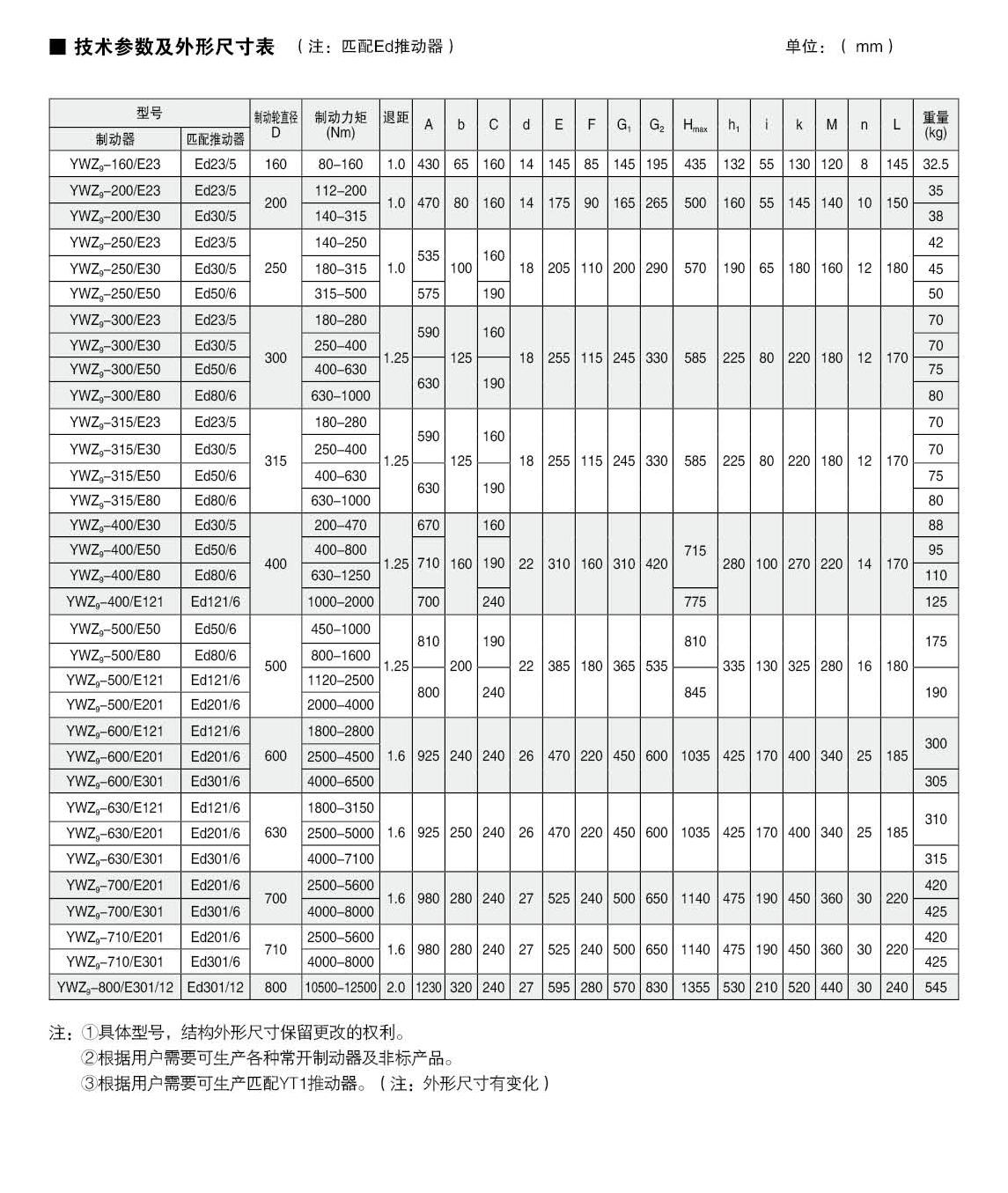 YWZ5系列電力液壓鼓式制動器的連接尺寸和制動力矩參數(shù)符合GB6333-86標準,技術(shù)要求符合JB / T6406-2006標準,配套符合DIN15430標準的Ed系列推動器。