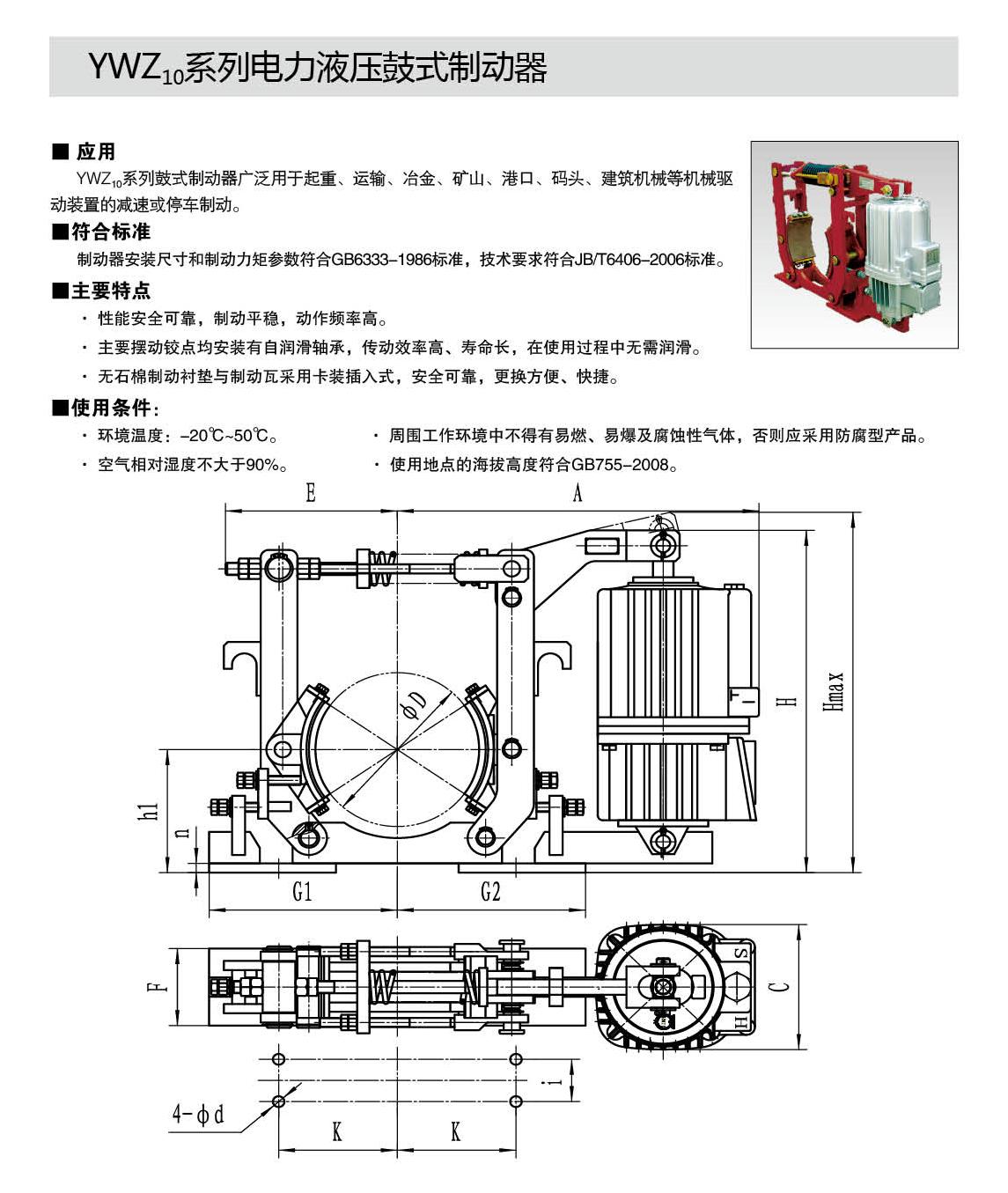 YWZ10,YWZ12系列電力液壓鼓式制動器的連接尺寸和制動力矩參數(shù)符合GB6333-86標準,技術要求符合JB / T6406-2006標準,配套符合DIN15430標準的Ed系列推動器。